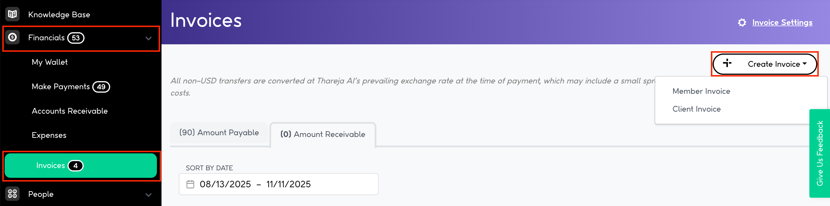 STEP 1. Navigate to Financials -> Invoices and click the Create Invoice button. If you’re an employee/ member billing your organisation, then click Member Invoice and if you are an organisation owner, then choose Client Invoice.